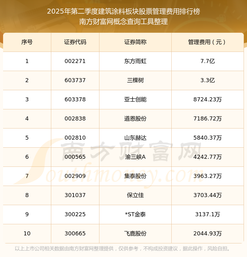 2025年第二季度,建筑涂料板塊股票管理費(fèi)用排行榜中,東方雨虹(002271)的管理費(fèi)用總額高達(dá)7.7億,三棵樹(603737)和亞士創(chuàng)能(603378)分別位居第二和第三,道恩股份(002838)、山東赫達(dá)(002810)、渝三峽A(000565)、集泰股份(002909)、保立佳(301037)、*ST金泰(300225)、飛鹿股份(300665)分別進(jìn)入前十,其管理費(fèi)用總額分別排名第4-10名。
