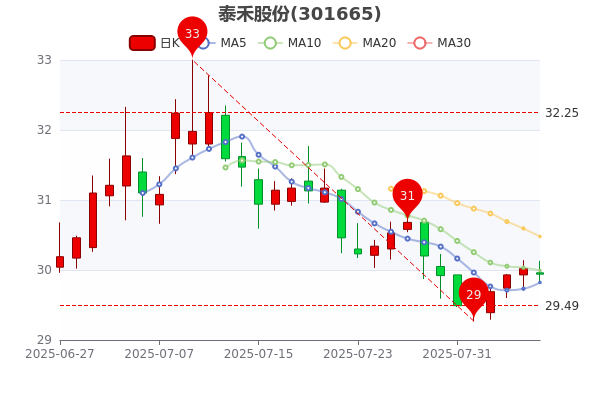 8月7日消息,泰禾股份開盤報價29.96元,收盤于29.940元,跌0.27%。當日最高價30.13元,市盈率46.06。
