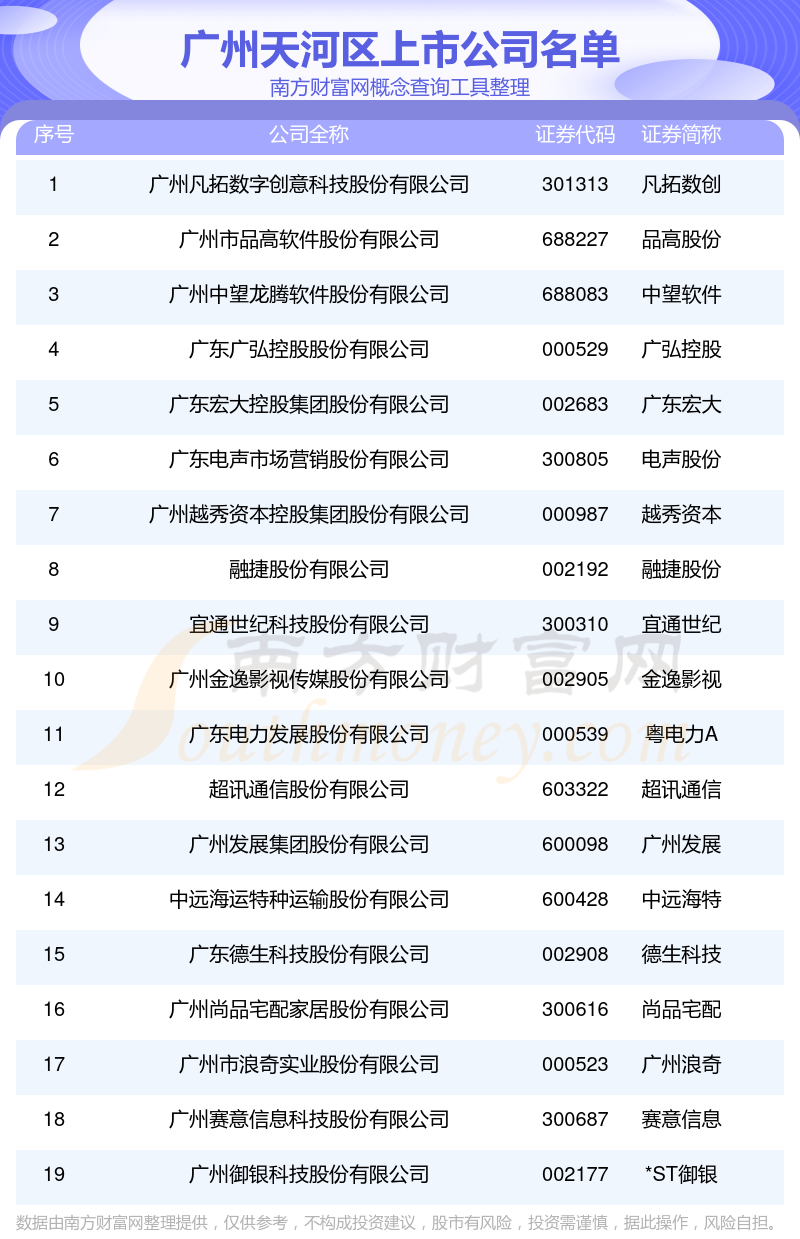 廣州天河區(qū)的上市公司都有哪些?南方財(cái)富網(wǎng)趨勢(shì)選股系統(tǒng)為您整理了歸屬于廣州天河區(qū),并且在A股上市的公司。
