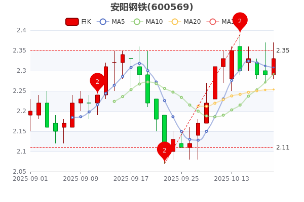 10月20日安陽鋼鐵消息,該股最新報2.330元漲1.75%,成交總金額8035萬元,市值為66.93億元。