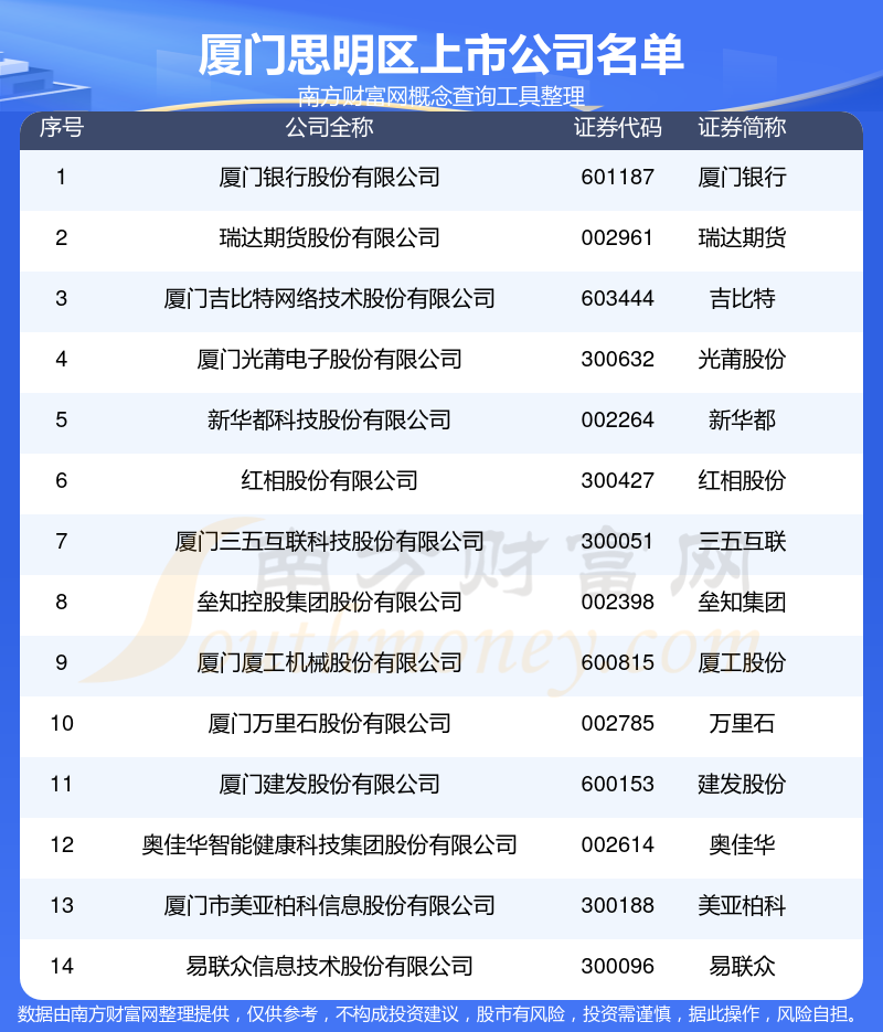 從數(shù)量方面來看,截至10月20日,廈門思明區(qū)共有14家A股上市公司。具體分布為,上交所:建發(fā)股份、廈工股份、廈門銀行、吉比特等4家,深交所:新華都、壘知集團(tuán)、奧佳華、萬里石、瑞達(dá)期貨、璉升科技、易聯(lián)眾、國投智能、紅相股份、光莆股份等10家。