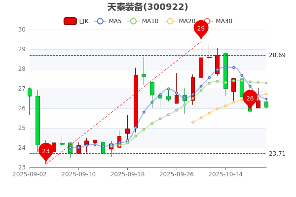 天秦裝備公司2025年第二季度營收約6081.32萬元,同比增長10.68%;凈利潤約677.99萬元,同比增長20.36%;基本每股收益0.04元。