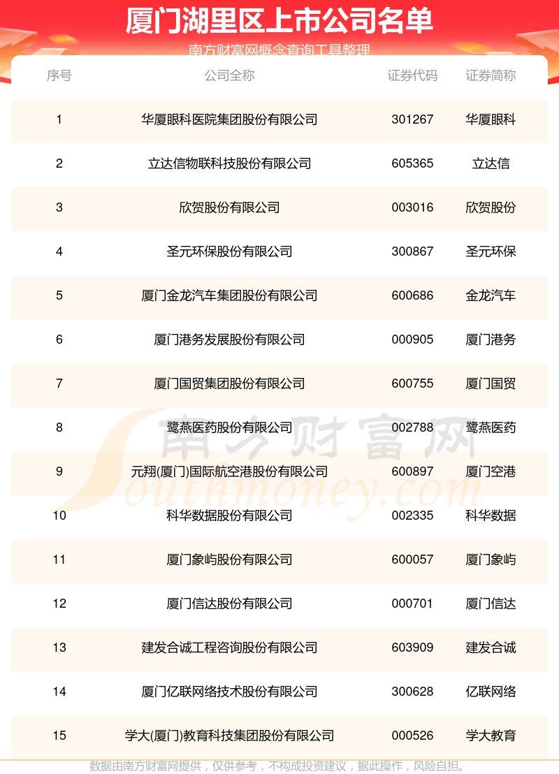 數(shù)量上,截至10月21日,廈門湖里區(qū)共有15家A股上市公司。其中,上交所6家(廈門象嶼、金龍汽車、廈門國貿(mào)、廈門空港、建發(fā)合誠、立達信等),深交所9家(學大教育、廈門信達、廈門港務、科華數(shù)據(jù)、鷺燕醫(yī)藥、欣賀股份、億聯(lián)網(wǎng)絡、圣元環(huán)保、華廈眼科等)。