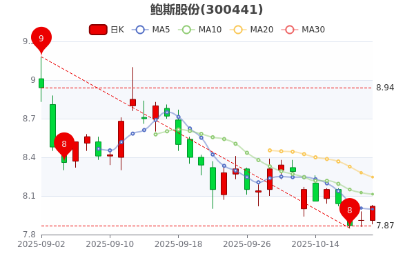 10月17日收盤(pán)消息,鮑斯股份(300441)股價(jià)報(bào)8.020元/股,跌2.11%。7日內(nèi)股價(jià)下跌1.62%,今年來(lái)漲幅下跌-8.73%,成交總金額4020.8萬(wàn)元,成交量503.3萬(wàn)手。