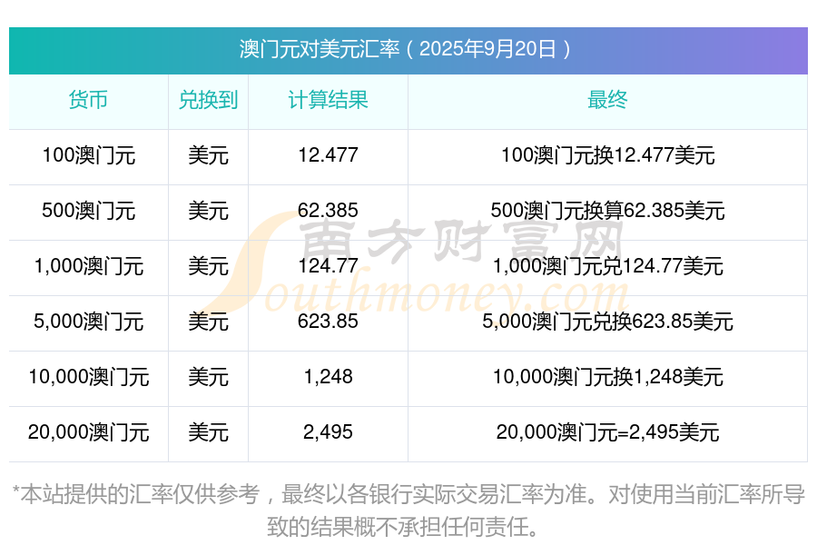 2025年9月20日匯率行情:22澳門元對美元匯率多少