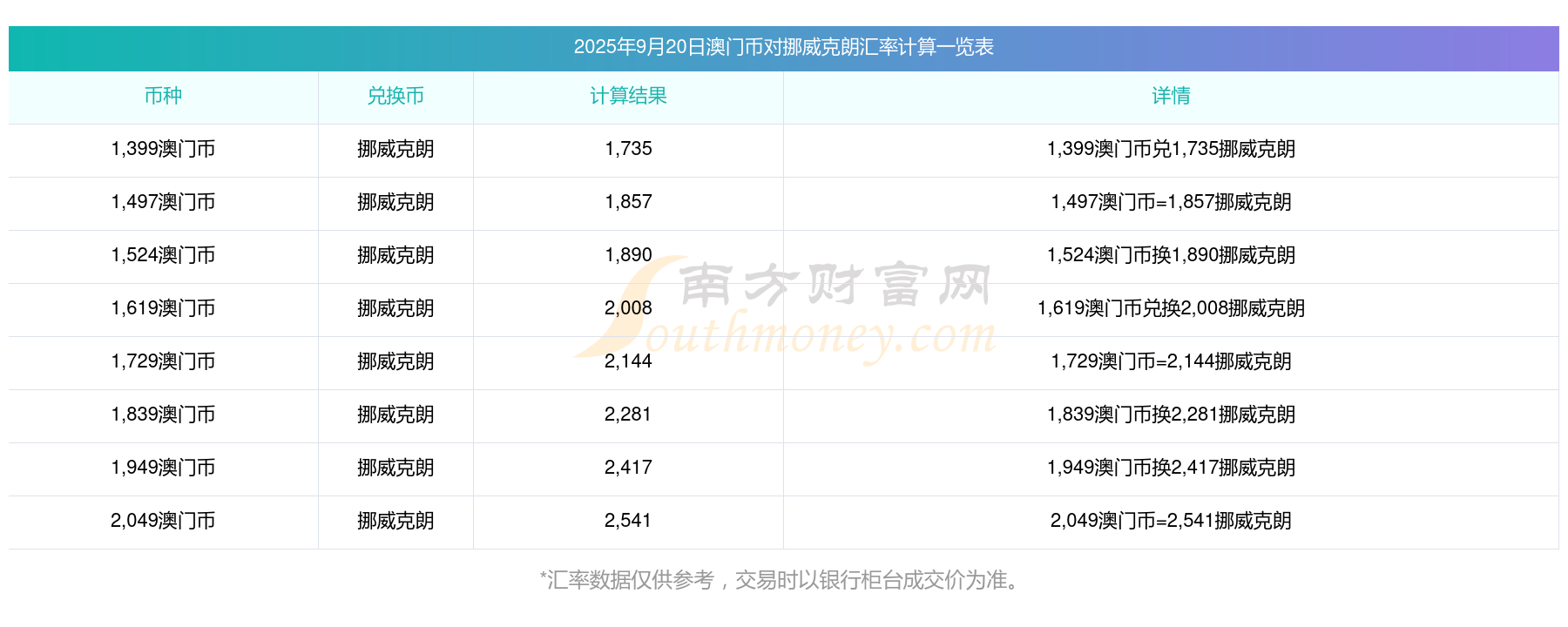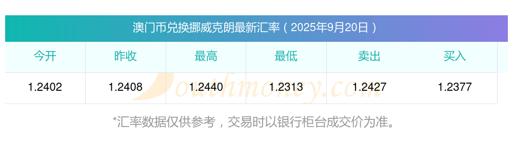 今日澳門幣匯價:2025年9月20日35澳門幣兌挪威克朗匯價一覽表