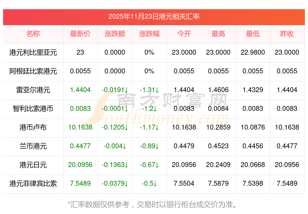 根據(jù)2025年11月23日匯率,港元兌換澳大利亞元匯率最新價(jià)0.199300,今開(kāi)價(jià)0.1991,昨收價(jià)0.1993,最高價(jià)0.2001,最低價(jià)0.1988。