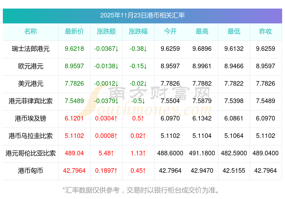 2025年11月23日港幣兌換歐元最新匯率:0.111612,今開:0.1116,昨收:0.1116,最高:0.1118,最低:0.1112。