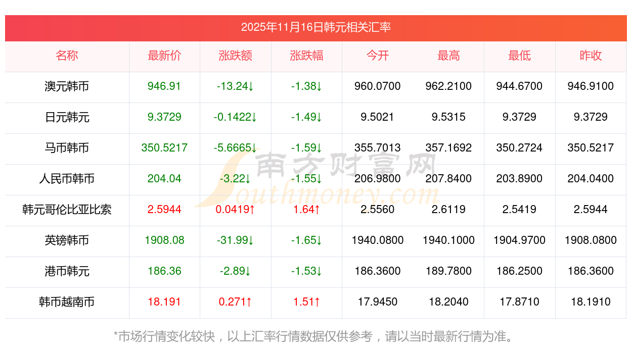 韓元對澳門元匯率價(jià)格查詢(2025年11月15日)