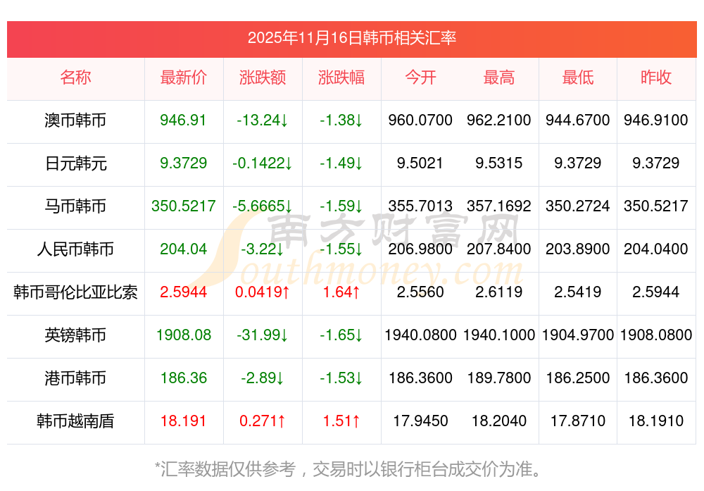 2025年11月16日韓幣相關(guān)匯率查詢(xún)