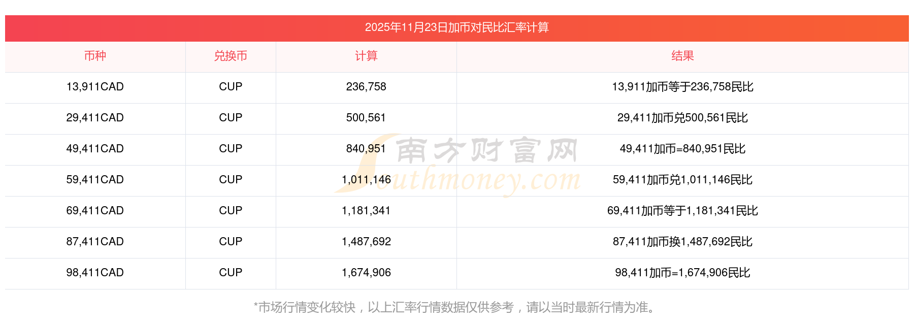2025年11月23日加幣與民比的兌換匯率計(jì)算如下: