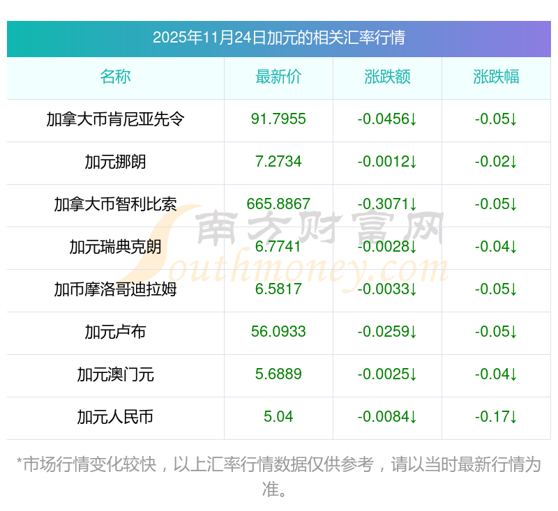 根據(jù)2025年11月24日匯率,加元兌換瑞郎匯率最新0.573300,今開0.5736,昨收0.5739,最高0.5739,最低0.5724。
