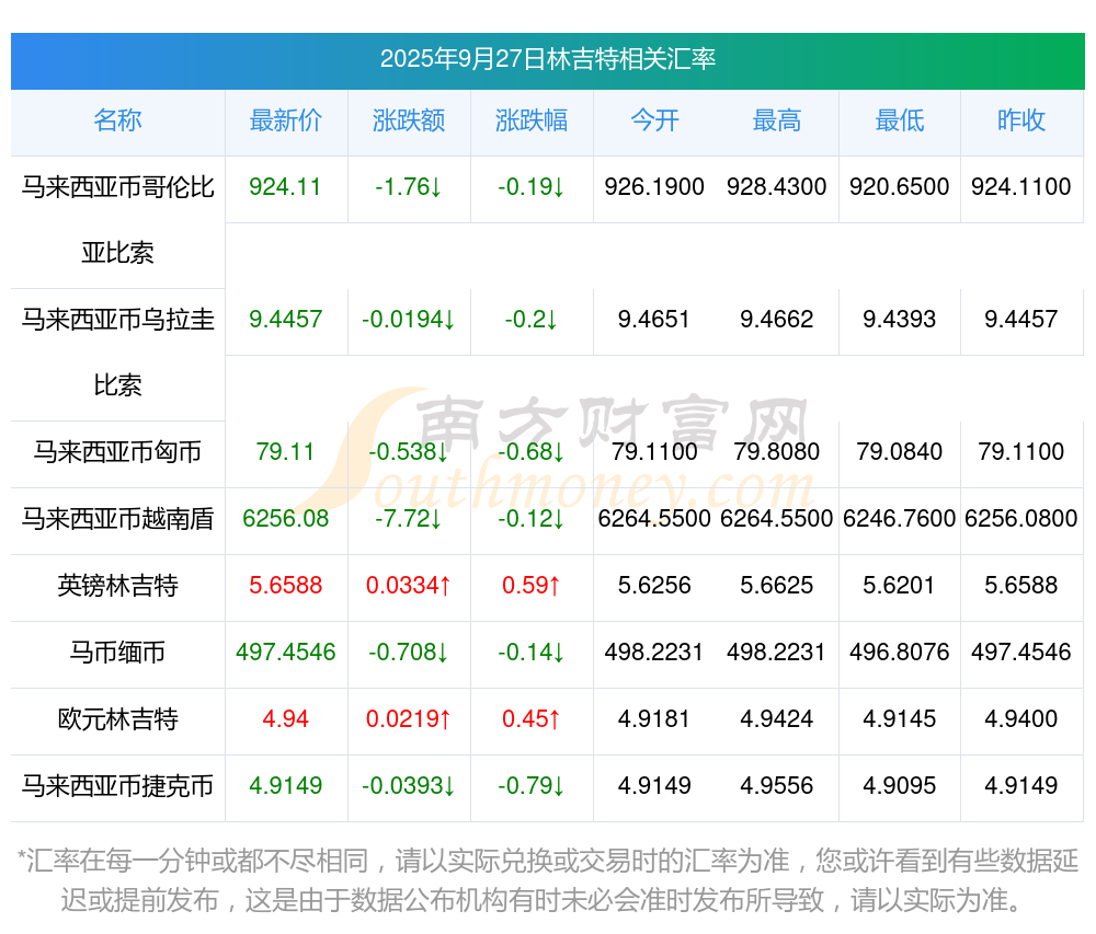 2025年9月27日林吉特相關(guān)匯率查詢
