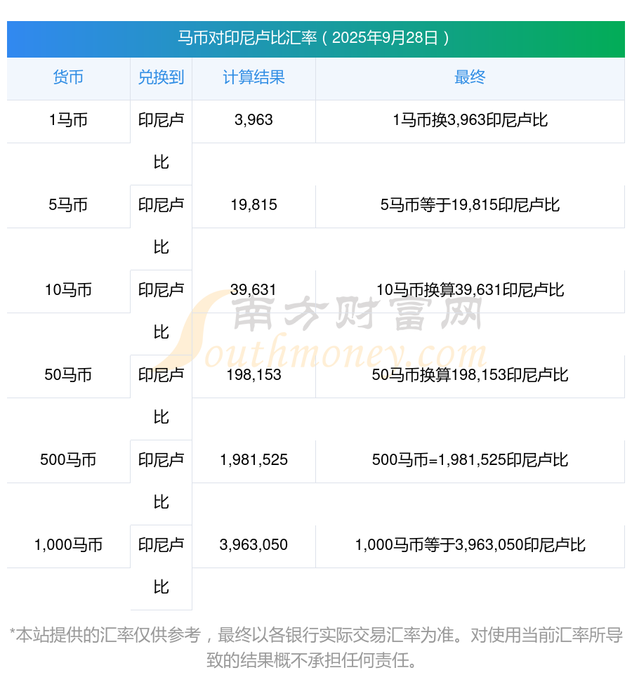 馬幣對印尼盧比的結(jié)匯價(jià)是多少?2025年9月28日