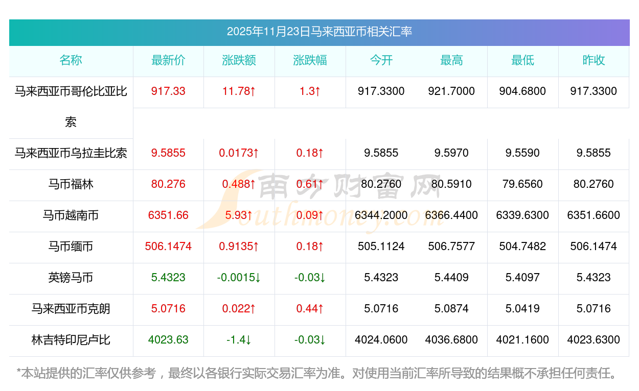 2025年11月23日馬來西亞幣相關(guān)匯率查詢