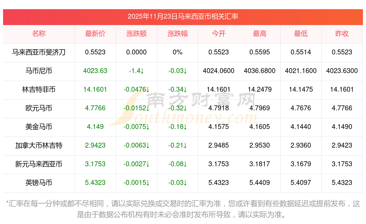 2025年11月23日馬來西亞幣相關(guān)匯率查詢