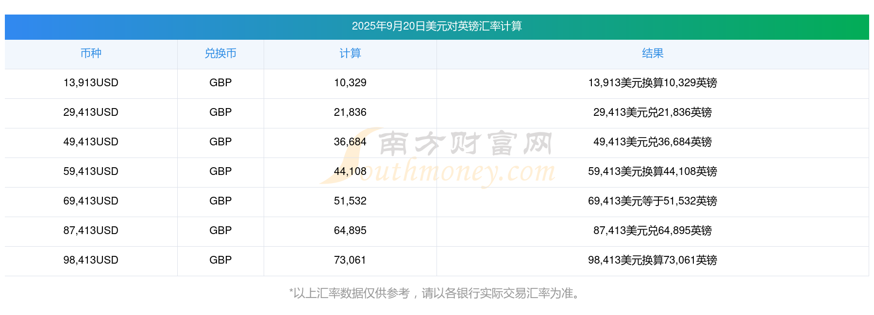 匯率實(shí)時(shí)更新!94美元兌換英鎊匯率表(2025年9月20日)