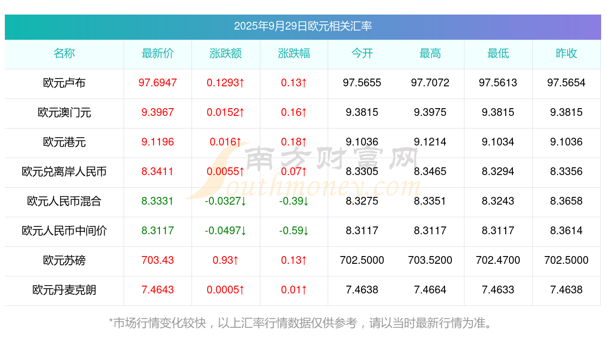 2025年9月29日歐元相關(guān)匯率查詢