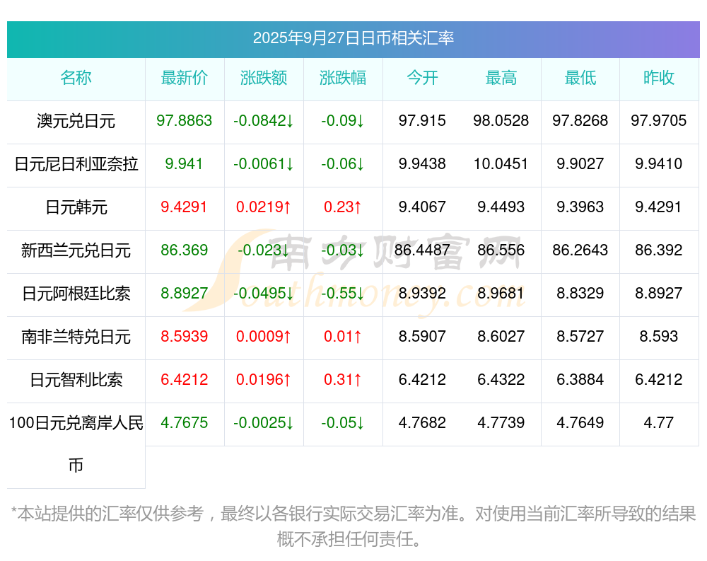 根據(jù)2025年9月27日匯率計算,JPY兌換DKK匯率最新價0.042662:今日開價0.0427,昨日收價0.0427,最高價0.0427,最低價0.0426。