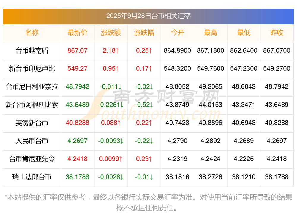 根據(jù)2025年9月28日匯率計算,TWD兌換KES匯率最新價4.241800,今開價4.2319,昨收價4.2418,最高價4.2424,最低價4.2226。