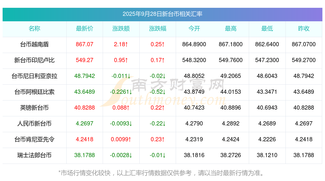 根據2025年9月28日匯率計算,TWD兌換MAD匯率最新價0.298500:今日開價0.2987,昨日收價0.2985,最高價0.2992,最低價0.2968。