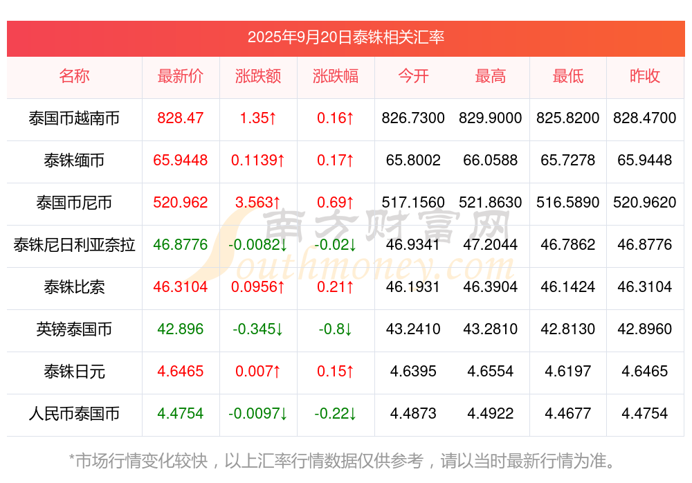根據(jù)2025年9月20日匯率,泰銖兌換林吉特匯率最新0.132109,今開0.1315,昨收0.1321,最高0.1324,最低0.1314。
