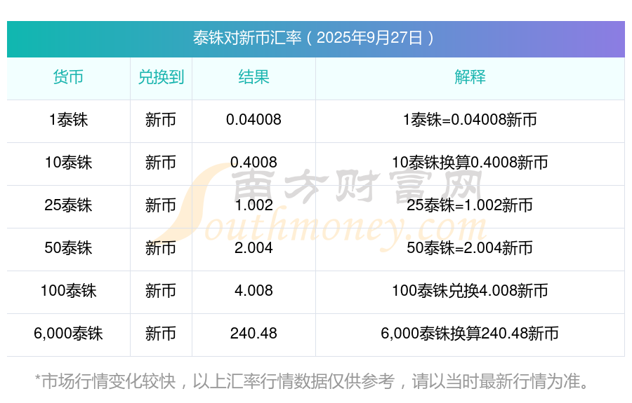 南方財富網(wǎng)為您提供泰銖對新幣匯率最新價格詳情。