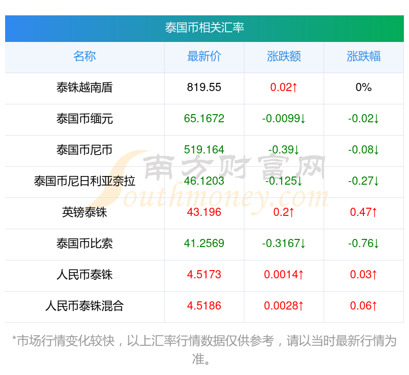 南方財(cái)富網(wǎng)為您提供泰國幣對巴西雷亞爾匯率最新價(jià)格詳情。