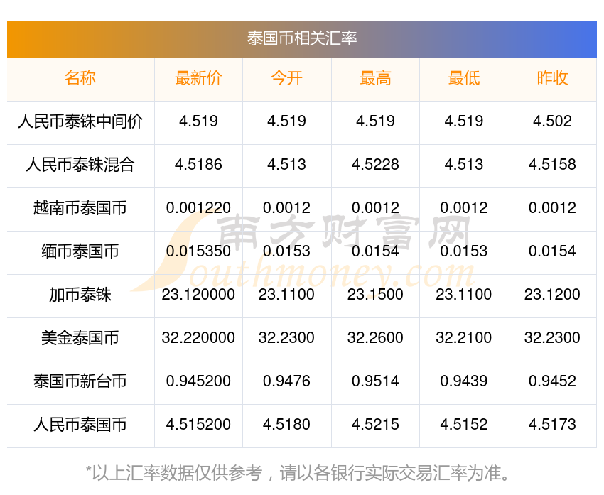 南方財富網(wǎng)為您提供泰國幣對美金匯率最新價格詳情。