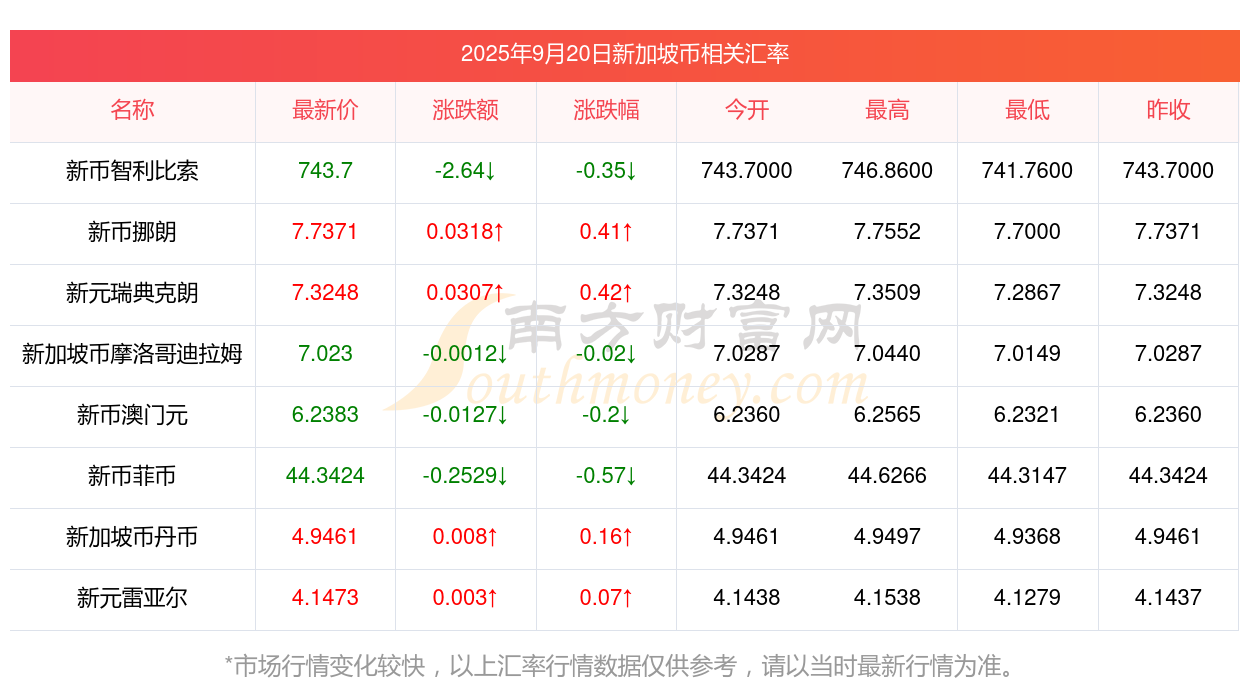 2025年9月20日新加坡幣相關(guān)匯率查詢