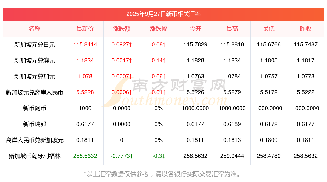 根據(jù)2025年9月27日匯率,新幣兌換巴幣匯率最新價(jià)4.142200,今開價(jià)4.1368,昨收價(jià)4.1368,最高價(jià)4.1520,最低價(jià)4.1297。