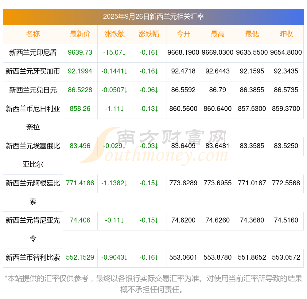 2025年9月26日新西蘭元相關(guān)匯率查詢