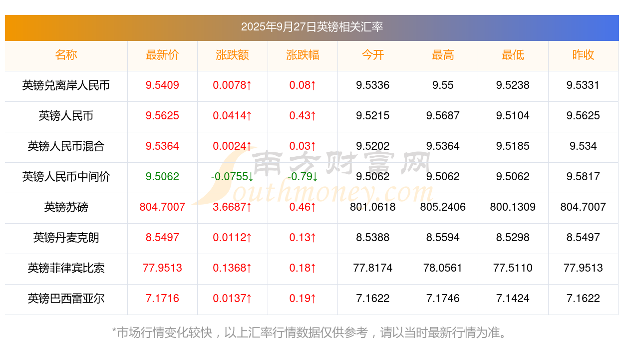 根據(jù)今天2025年9月27日匯率計算,GBP兌換CHF匯率最新價1.069500,今開價1.0671,昨收價1.0695,最高價1.0707,最低價1.0664。