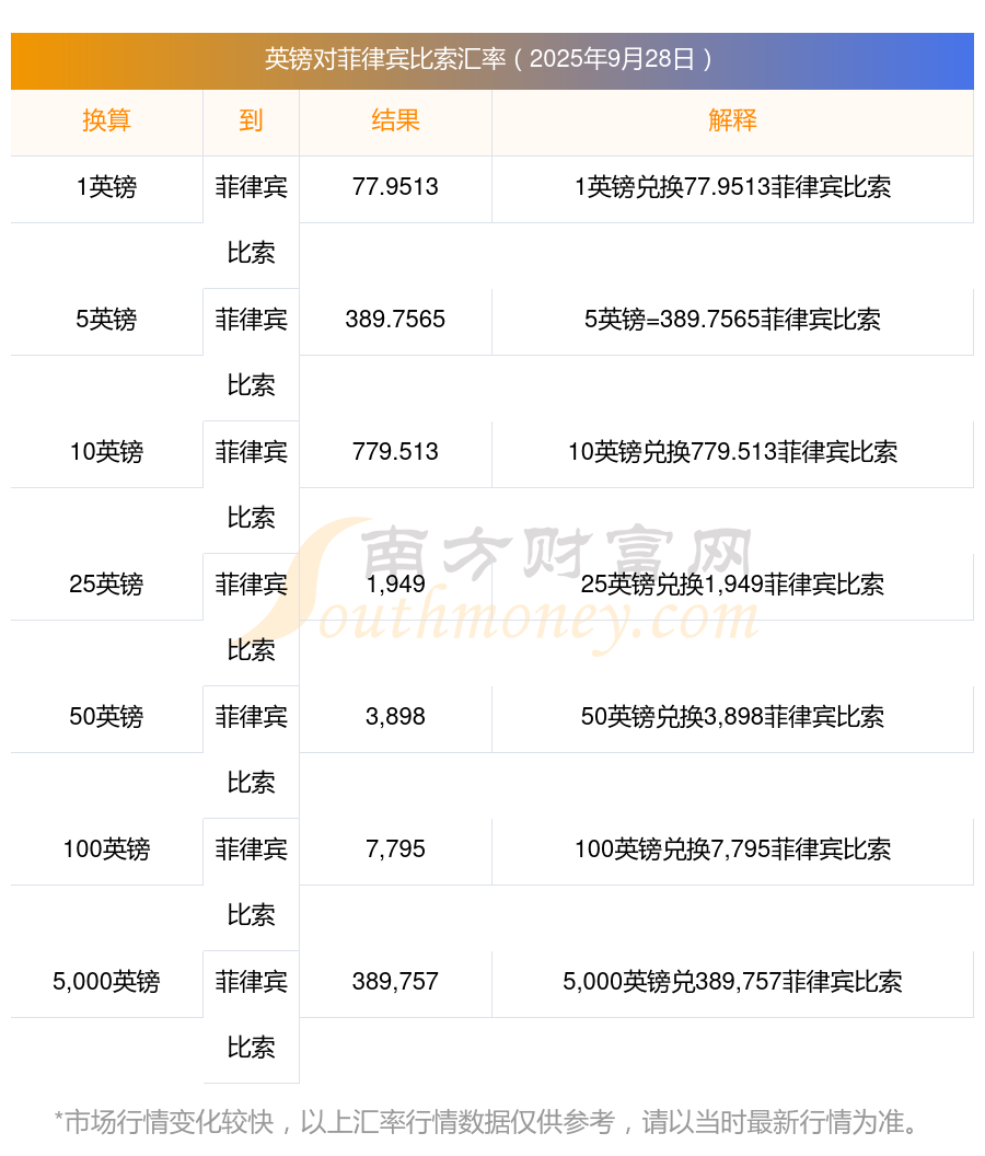 南方財(cái)富網(wǎng)為您提供英鎊對菲律賓比索匯率最新價(jià)格詳情。