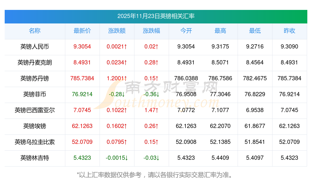 根據(jù)2025年11月23日匯率計算,英鎊兌換越南盾匯率最新價34504.000000,今開價34504.0000,昨收價34504.0000,最高價34549.0000,最低價34361.0000。