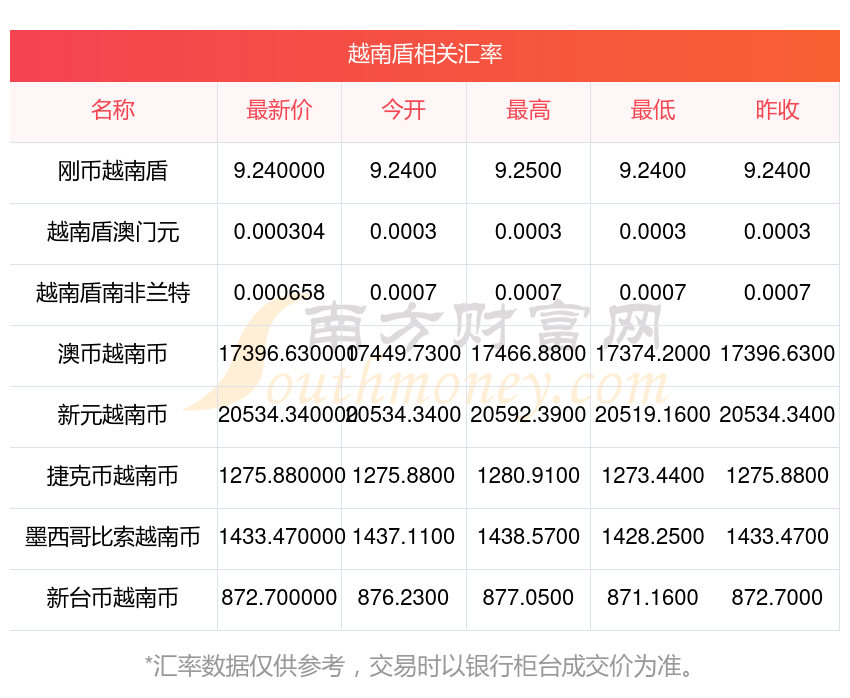 根據(jù)2025年9月20日匯率計(jì)算,VND兌換NOK匯率最新價(jià)0.000377,今開價(jià)0.0004,昨收價(jià)0.0004,最高價(jià)0.0004,最低價(jià)0.0004。