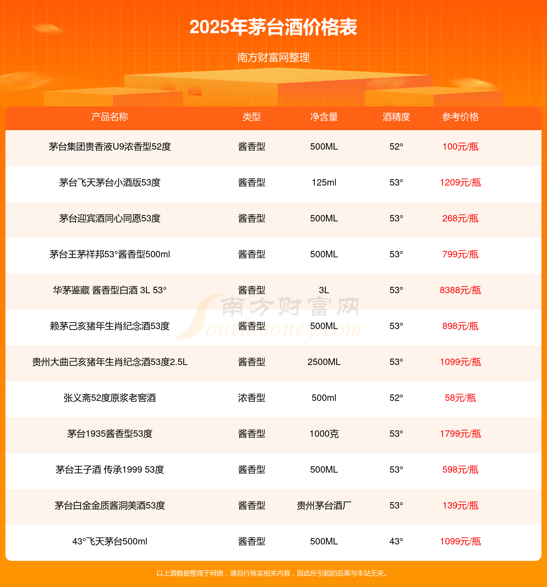 2025茅臺(tái)酒最新價(jià)格:華茅鑒藏 醬香型白酒 3L 53°參考價(jià)8388元/瓶、53度五星茅臺(tái)生肖酒丁酉雞年參考價(jià)2798元/瓶、貴州茅臺(tái)己亥豬年生肖酒53°500ml參考價(jià)2699元/瓶、53度五星茅臺(tái)生肖酒戊戌狗年參考價(jià)2698元/瓶、飛天茅臺(tái)53°500ml(2015年)參考價(jià)2199元/瓶、茅臺(tái)王子酒己亥豬年生肖紀(jì)念酒53度2.5L參考價(jià)2099元/瓶、茅臺(tái)1935醬香型53度參考價(jià)1799元/瓶、茅臺(tái)財(cái)富貴賓典藏酒53度參考價(jià)1599元/瓶。