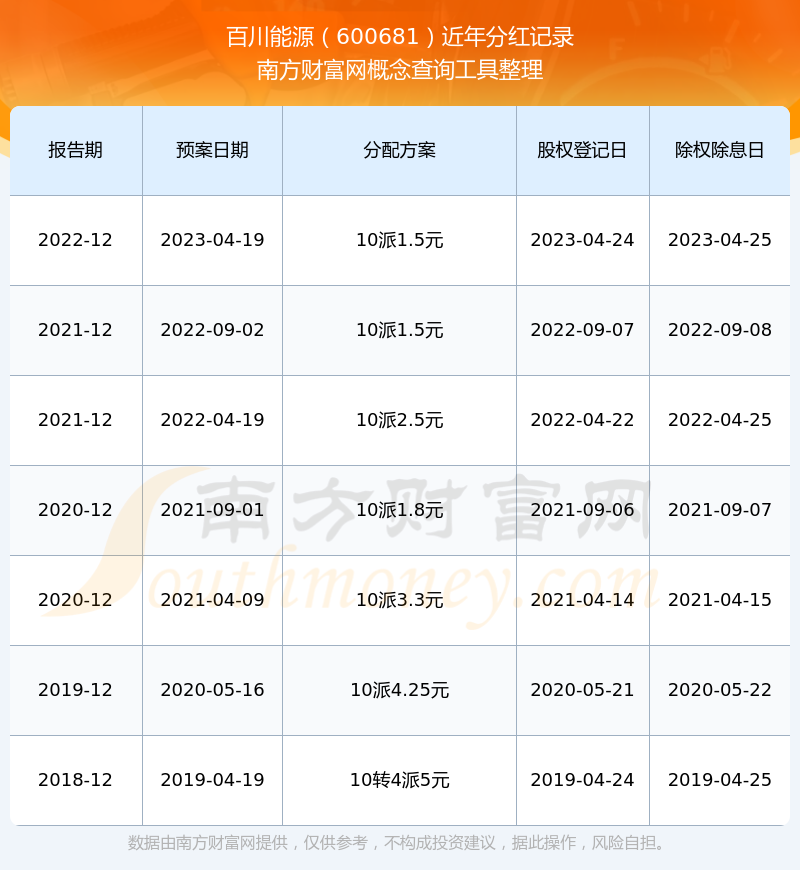 百川能源最新一次公布的分紅方案為10派1.5元。本次權(quán)益分派股權(quán)登記日為2023年4月24日,除權(quán)除息日為2023年4月25日,派息日為2023年4月25日。