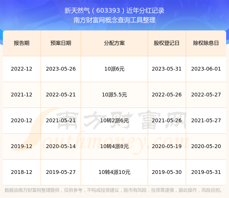 新天然氣最新一次公布的分紅方案為10派6元。本次權益分派股權登記日為2023年5月31日,除權除息日為2023年6月1日,派息日為2023年6月1日。