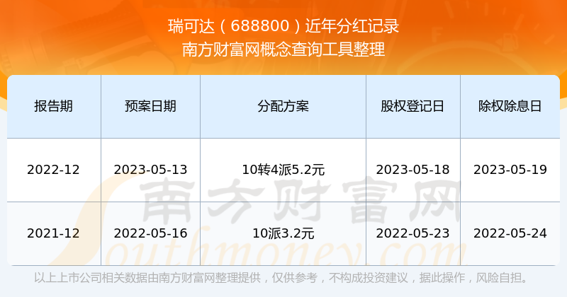 瑞可達(dá)最新一次公布的分紅方案為10轉(zhuǎn)4派5.2元。本次權(quán)益分派股權(quán)登記日為2023年5月18日,除權(quán)除息日為2023年5月19日,派息日為2023年5月19日。