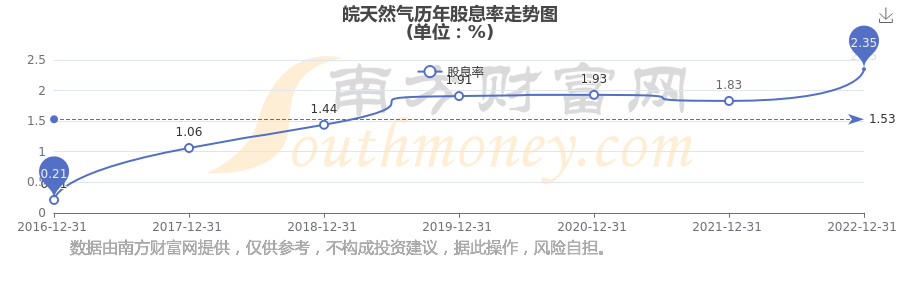 皖天然氣最新一次公布的分紅方案為10派2元。本次權益分派股權登記日為2023年6月2日,除權除息日為2023年6月5日,派息日為2023年6月5日。