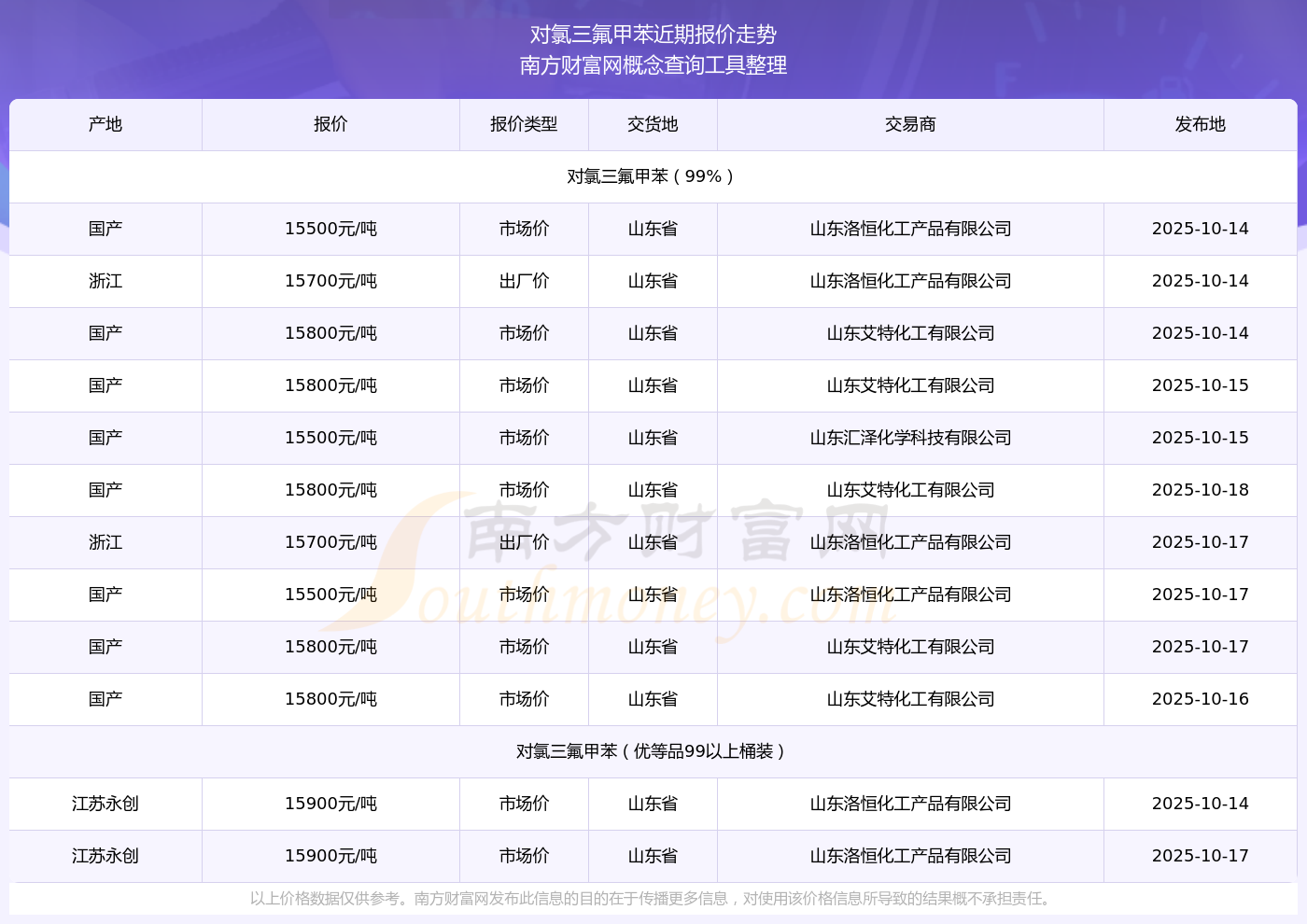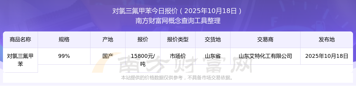 2025年10月18日,山東艾特化工有限公司對氯三氟甲苯(99%),國產(chǎn),交易地點為山東省,報價為15800.00元/噸。