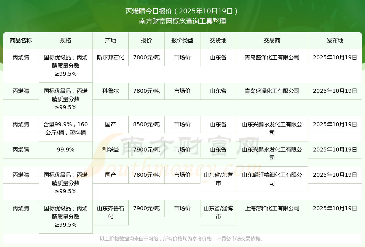 丙烯腈市場價(jià)報(bào)價(jià)行情(2025年10月19日)