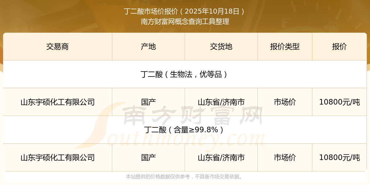 2025年10月18日,丁二酸(含量≥99.8%)市場價價格為10800.00元/噸,報價人:山東宇碩化工有限公司,交易地點(diǎn)為山東省/濟(jì)南市。