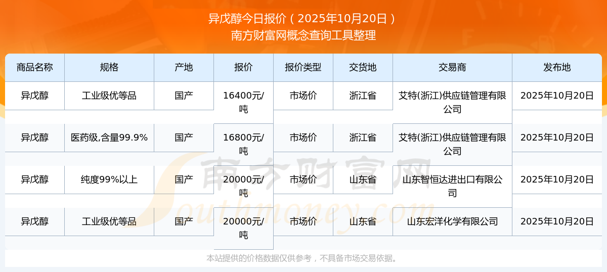 2025年10月20日,艾特(浙江)供應(yīng)鏈管理有限公司異戊醇(工業(yè)級(jí)優(yōu)等品),國(guó)產(chǎn),交易地點(diǎn)為浙江省,市場(chǎng)價(jià)報(bào)價(jià)為16400.00元/噸。