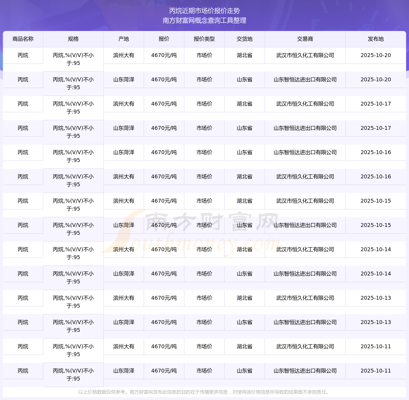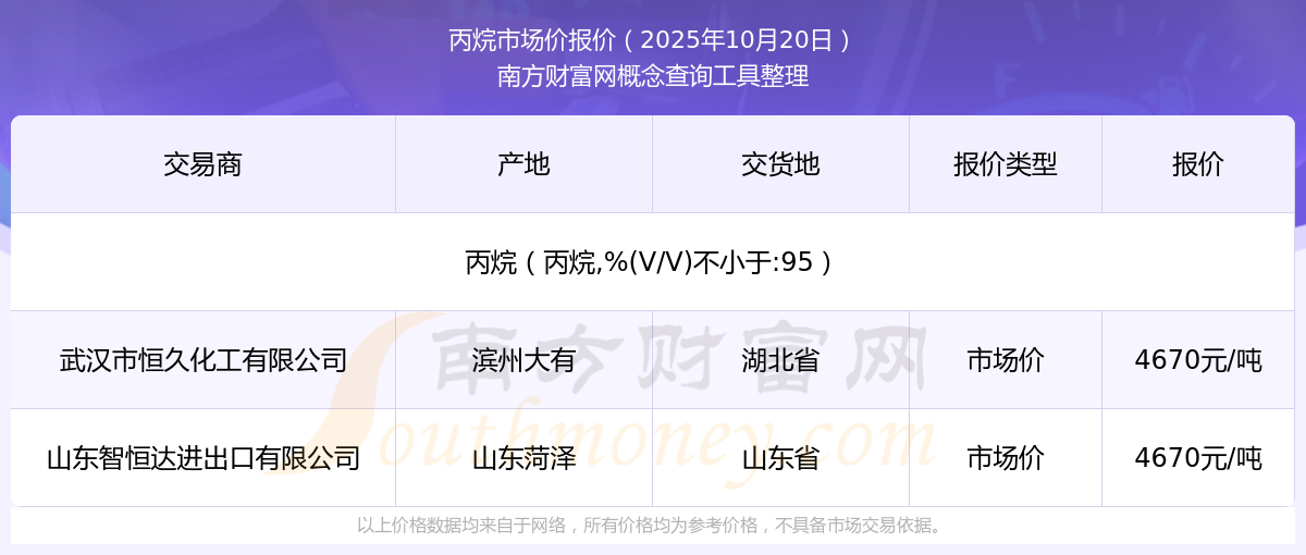 2025年10月20日,山東智恒達(dá)進(jìn)出口有限公司丙烷(丙烷,%(V/V)不小于:95),山東菏澤,交易地點(diǎn)為山東省,市場(chǎng)價(jià)報(bào)價(jià)為4670.00元/噸。
