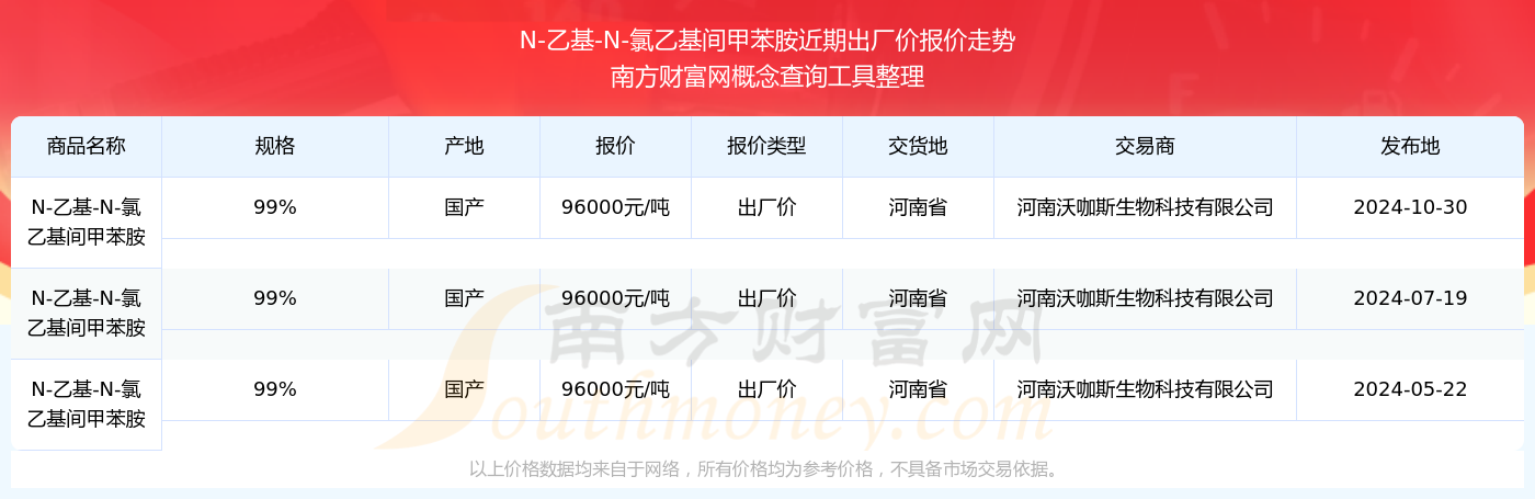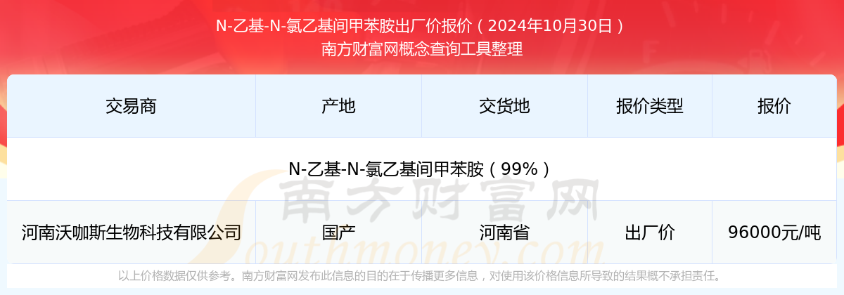 2024年10月30日,河南沃咖斯生物科技有限公司N-乙基-N-氯乙基間甲苯胺(99%),國產(chǎn),交易地點為河南省,出廠價報價為96000.00元/噸。