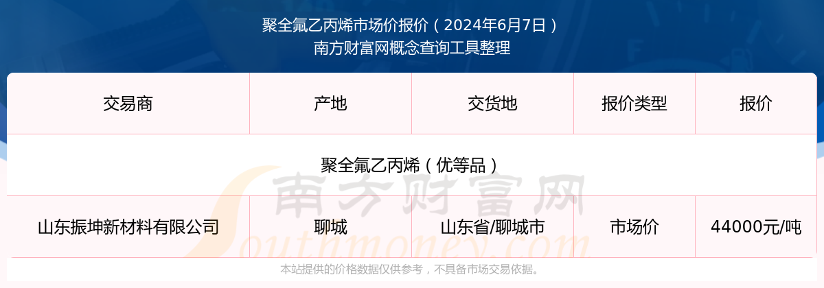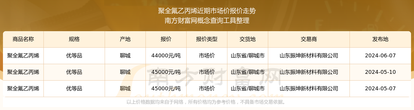 2024年6月7日,山東振坤新材料有限公司聚全氟乙丙烯(優(yōu)等品),聊城,交易地點(diǎn)為山東省/聊城市,市場(chǎng)價(jià)報(bào)價(jià)為44000.00元/噸。