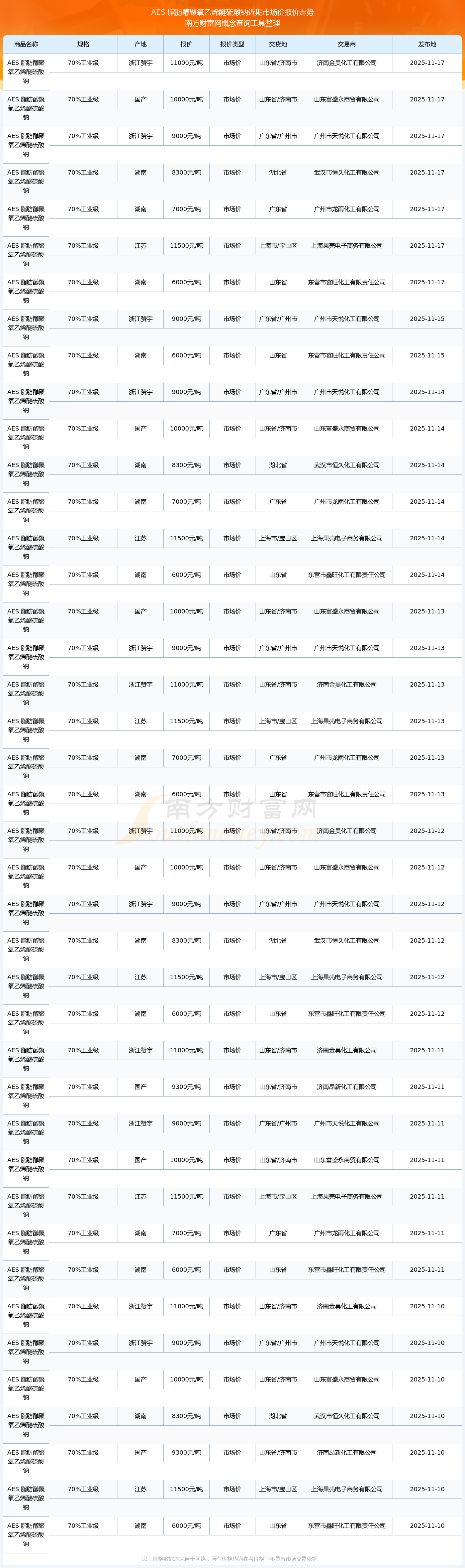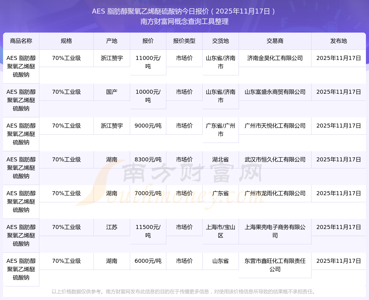 2025年11月17日,濟(jì)南金昊化工有限公司AES 脂肪醇聚氧乙烯醚硫酸鈉(70%工業(yè)級),浙江贊宇,交易地點(diǎn)為山東省/濟(jì)南市,市場價(jià)報(bào)價(jià)為11000.00元/噸。
