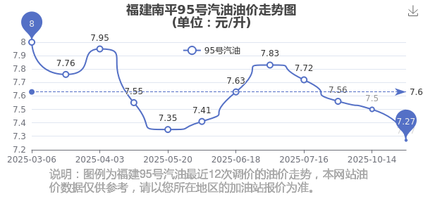 11月4日汽油、柴油的價格是10月28日調(diào)整后的價格,每升價格為:92號汽油為6.81元,降了0.21元,降幅達(dá)2.99%;95號汽油為7.27元,降了0.23元,降幅達(dá)3.07%;89號汽油為6.34元,降了0.2元,降幅達(dá)3.06%;0號柴油為6.47元,降了0.22元,降幅達(dá)3.29%。下一輪油價調(diào)整時間11月10日24時,距離現(xiàn)在還有6.96天。